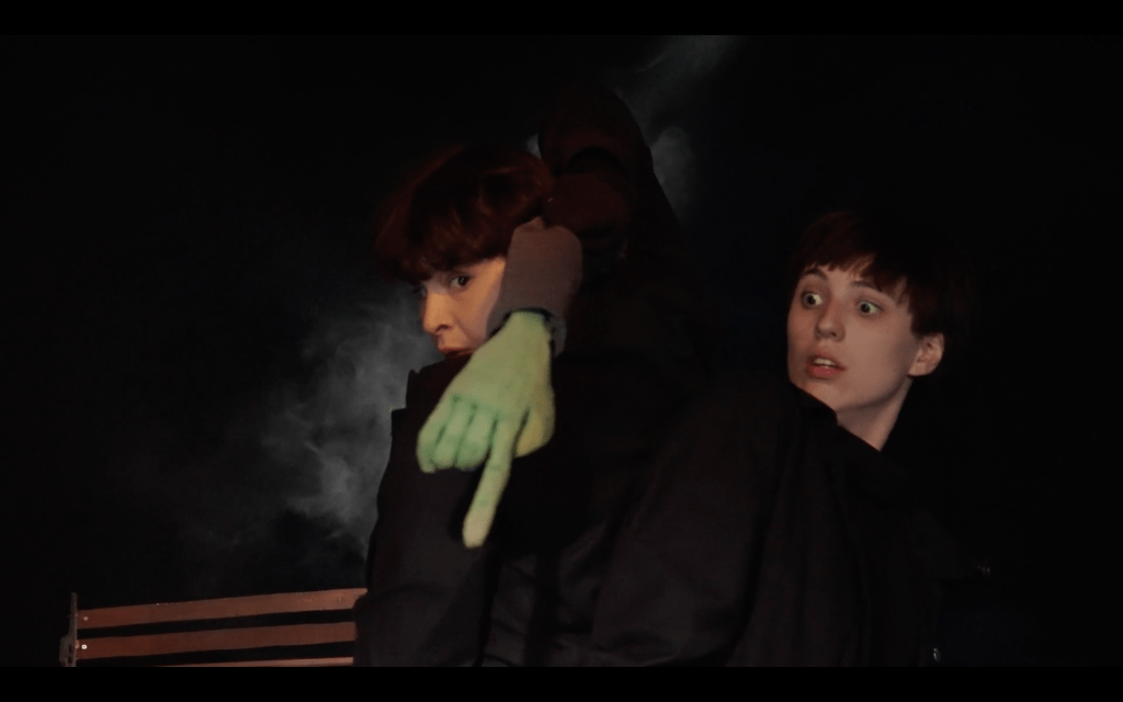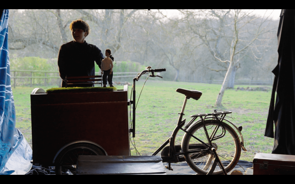 Un chapiteau. Du bruit venant de l’extérieur. Et puis deux paumées, visiblement en fuite, qui débarquent pour trouver refuge sous la tente. Leur moyen de fuite : un vélo triporteur sur lequel elles ont amassé quelques valises.